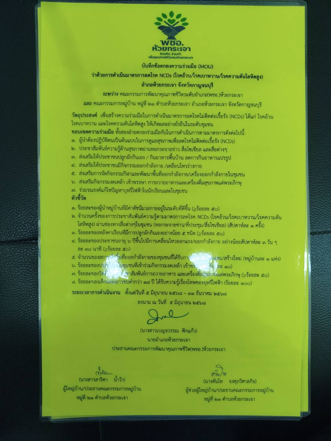 อ.ห้วยกระเจา จังหวัดกาญจนบุรี จัดทำ MOU ว่าด้วยการดำเนินมาตรการลดโรค NCDs(โรคอ้วน/เบาหวาน/ความดันโลหิตสูง) ระหว่างคณะกรรมการ พชอ.ห้วยกระเจา
