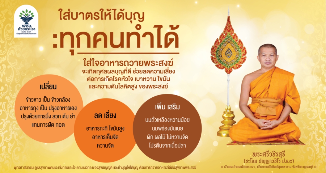 📌ประชาสัมพันธ์รณรงค์ “ใส่บาตรให้ได้บุญ ทุกคนทำได้” เพื่อเกิดกุศลผลบุญที่ดี ช่วยลดความเสี่ยงต่อการเกิดโรคอ้วน/โรคเบาหวาน/โรคความดันโลหิตสูง ในพระสงฆ์  ซึ่งสามารถทำได้โดย