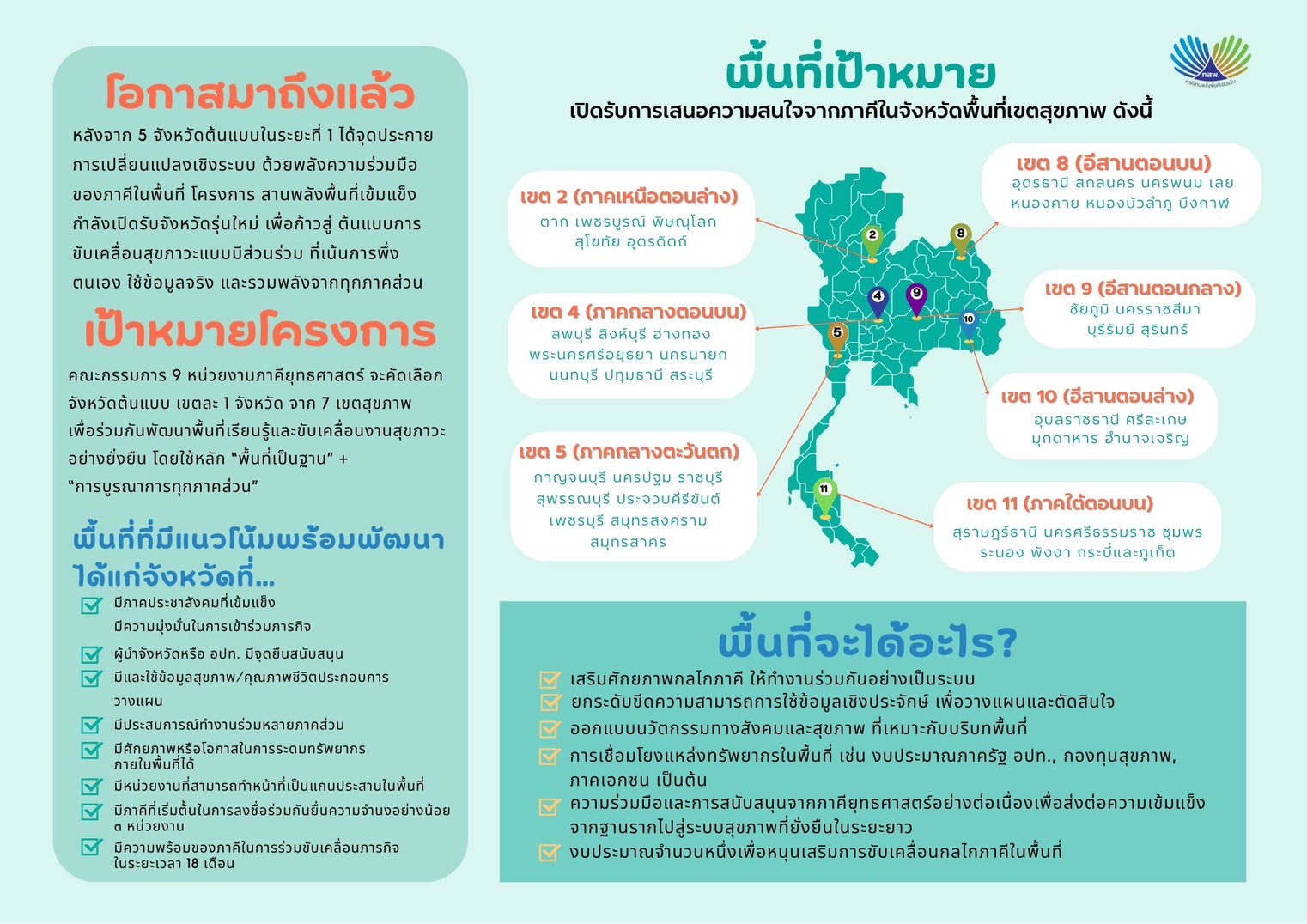 เปิดรับการเสนอความสนใจจากภาคีในจังหวัด พื้นที่เขตสุขภาพ ดังนี้: เขต 2 (ภาคเหนือตอนล่าง) เขต 4 (ภาคกลางตอนบน) เขต 5 (ภาคกลางตะวันตก) เขต 8 (อีสานตอนบน) เขต 9 (อีสานตอนกลาง) เขต 10 (อีสานตอนล่าง) เขต 11 (ภาคใต้ตอนบน)