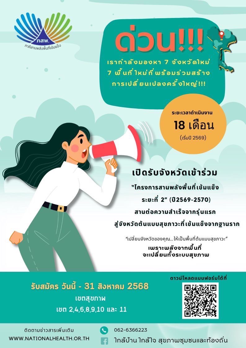 โครงการ สานพลังพื้นที่เข้มแข็ง กำลังเปิดรับจังหวัดรุ่นใหม่ เพื่อก้าวสู่ ต้นแบบการขับเคลื่อนสุขภาวะแบบมีส่วนร่วมที่เน้นการพึ่งตนเอง ใช้ข้อมูลจริง และรวมพลังจากทุกภาคส่วน