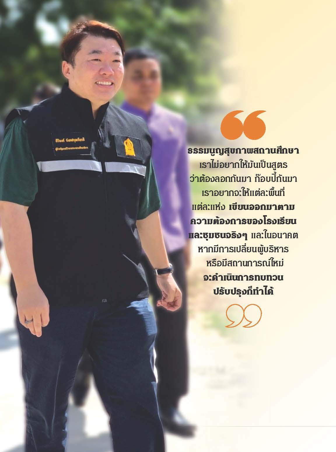 อย่างที่บอกว่า ทุกคนฝากความหวังไว้ที่ ศธ. การดูแลเด็กคนหนึ่งจึงไม่ใช่แค่การให้ความรู้อย่างเดียว ในยุคปัจจุบันถ้าเด็กร้องไห้มาโรงเรียน เราต้องหาคำตอบ ว่าทำไมเด็กถึงร้องไห้ ไม่มีความสุขตรงไหน? แนวทางมันเปลี่ยนไป เราต้องให้ความสำคัญกับสุขภาวะทั้ง 4 มิติ (กาย ใจ สังคม ปัญญา) มากขึ้น ซึ่งท่าน พล.ต.อ.เพิ่มพูน ชิดชอบ รัฐมนตรีว่าการกระทรวงศึกษาธิการ มอบหมายให้ผมดูแลเรื่องนี้