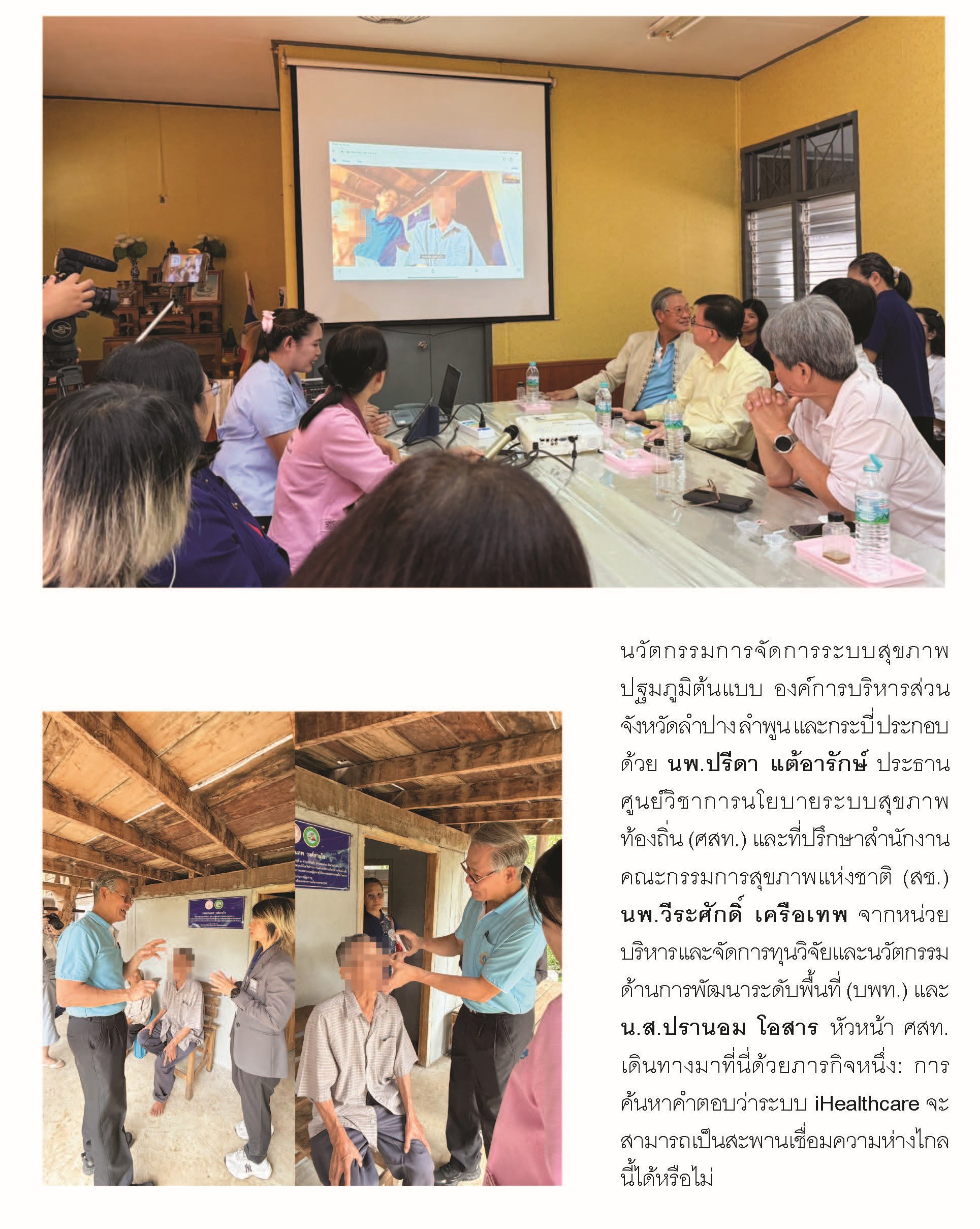ทีมวิจัยของเราภายใต้โครงการวิจัยการต่อยอดจากระบบโทรเวชกรรม (Telemedicine) สู่ระบบบริการสุขภาพทางไกลบูรณาการ (Telehealth) และศูนย์นวัตกรรมการจัดการระบบสุขภาพปฐมภูมิต้นแบบ องค์การบริหารส่วนจังหวัดลำปาง ลำพูน และกระบี่ ประกอบด้วย นพ.ปรีดา แต้อารักษ์ ประธานศูนย์วิชาการนโยบายระบบสุขภาพท้องถิ่น (ศสท.) และที่ปรึกษาสำนักงานคณะกรรมการสุขภาพแห่งชาติ (สช.) นพ.วีระศักดิ์ เครือเทพ จากหน่วยบริหารและจัดการทุนวิจัยและนวัตกรรมด้านการพัฒนาระดับพื้นที่ (บพท.) และ น.ส.ปรานอม โอสาร หัวหน้า ศสท. เดินทางมาที่นี่ด้วยภารกิจหนึ่ง: การค้นหาคำตอบว่าระบบ iHealthcare จะสามารถเป็นสะพานเชื่อมความห่างไกลนี้ได้หรือไม่