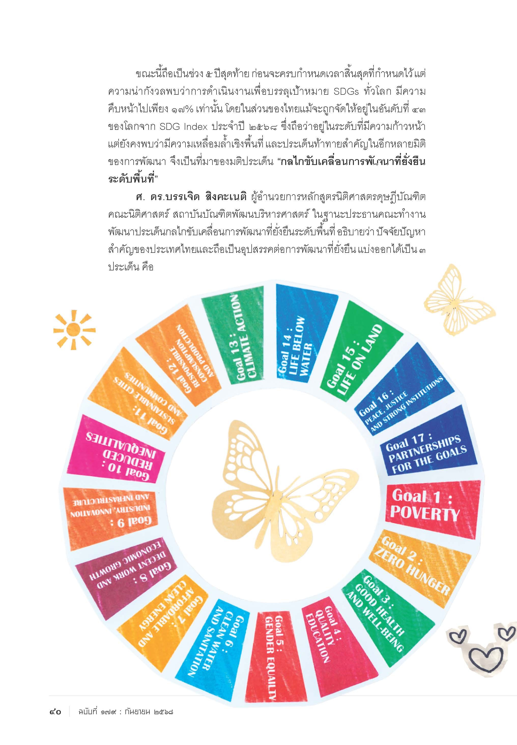 เมื่อ ๑๐ ปีที่แล้ว สมาชิกองค์การสหประชาชาติจำนวน ๑๙๓ ประเทศ ซึ่งรวมถึงประเทศไทย ได้ร่วมกันให้การรับรองเป้าหมายการพัฒนาที่ยั่งยืน (Sustainable Development Goals: SDGs) เป็นทิศทางการพัฒนาที่ทุกประเทศต้องดำเนินการร่วมกันภายใต้ ๑๗ เป้าหมาย (Goals) ที่ครอบคลุมทุกมิติตั้งแต่สังคม เศรษฐกิจ สิ่งแวดล้อม ไปจนถึงสุขภาพ โดยกำหนดกรอบช่วงระยะเวลาบรรลุผลภายใน ๑๕ ปี ตั้งแต่ปี ค.ศ. ๒๐๑๖ – ๒๐๓๐