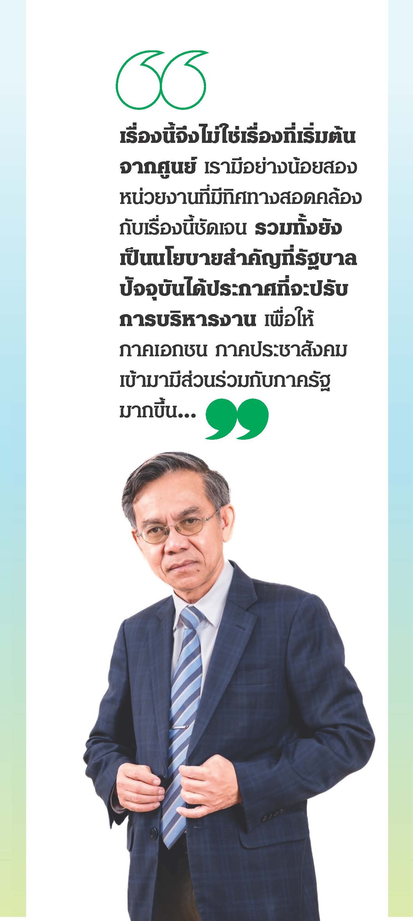 “เรื่องนี้จึงไม่ใช่เรื่องที่เริ่มต้นจากศูนย์ เรามีอย่างน้อยสองหน่วยงานที่มีทิศทางสอดคล้องกับเรื่องนี้ชัดเจน รวมทั้งยังเป็นนโยบายสำคัญที่รัฐบาลปัจจุบันได้ประกาศที่จะปรับการบริหารงาน เพื่อให้ภาคเอกชน ภาคประชาสังคม เข้ามามีส่วนร่วมกับภาครัฐมากขึ้น จึงต้องบอกว่านี่เป็นช่วงของโอกาสที่ดีที่สุดในการที่จะขับเคลื่อนเรื่องนี้ การที่เราจะใช้หลักการสามเหลี่ยมเขยื้อนภูเขาเป็นจุดสำคัญ” อาจารย์ผู้เชี่ยวชาญด้านกฎหมายการเมืองการปกครองรายนี้ ระบุ