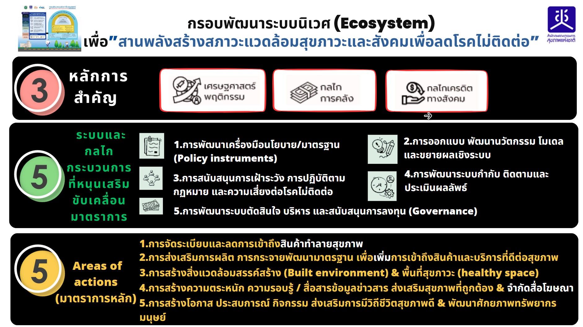 2. การใช้แนวคิดระบบนิเวศ (Ecosystem) โดยนำหลักเศรษฐศาสตร์พฤติกรรม กลไกการคลัง และการสร้างแรงจูงใจมาใช้ในการลดพฤติกรรมเสี่ยงในทุก Setting