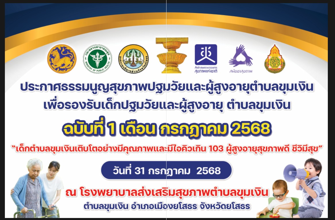วันที่ 31 กรกฎาคม พ.ศ. 2568 ณ โรงพยาบาลส่งเสริมสุขภาพตำบลขุมเงิน อำเภอเมือง จังหวัดยโสธร จัดเวที “ประกาศใช้ธรรมนูญสุขภาพตำบลขุมเงิน” อำเภอเมือง จังหวัดยโสธร อย่างเป็นทางการ จำนวน 2 ฉบับ ได้แก่ ธรรมนูญสุขภาพด้านการส่งเสริมสุขภาพอนามัยแม่และเด็ก และพัฒนาการเด็กปฐมวัยต้นแบบด้านโภชนาการ พ.ศ. 2568 และ 2 .ธรรมนูญสุขภาพผู้สูงอายุตำบลขุมเงิน พ.ศ. 2568