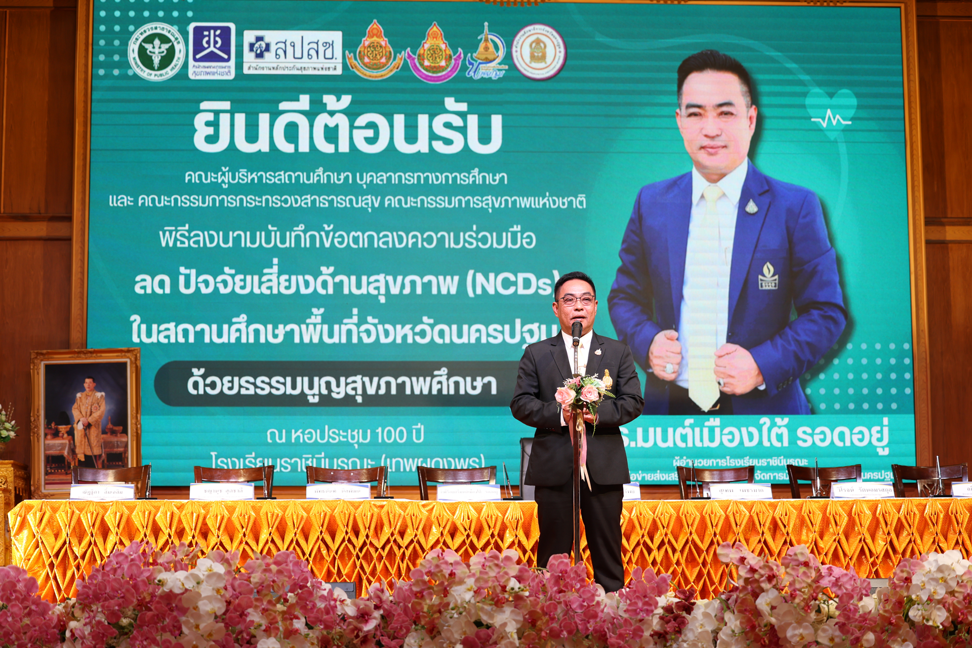 เมื่อวันที่ 13.. 2568 นายอนุชา สะสมทรัพย์ รัฐมนตรีช่วยว่าการกระทรวงสาธารณสุข (สธ.) และรองประธานกรรมการสุขภาพแห่งชาติ (คสช.) เป็นประธานในพิธีลงนามบันทึกความเข้าใจ (MOU) ความร่วมมือในการพัฒนาระบบสนับสนุนการสร้างสภาพแวดล้อมที่เอื้อต่อสุขภาพ เพื่อลดปัจจัยเสี่ยงจากโรคไม่ติดต่อ (NCDs) ด้วยธรรมนูญสุขภาพสถานศึกษาพื้นที่ จังหวัดนครปฐม ระหว่างสำนักงานคณะกรรมการสุขภาพแห่งชาติ (สช.) ร่วมกับ สำนักงานสาธารณสุขจังหวัดนครปฐม สำนักงานศึกษาธิการจังหวัดนครปฐม และสำนักงานเขตพื้นที่การศึกษาภายในจังหวัด ณ โรงเรียนราชินีบูรณะ (เทพผดุงพร) อ.เมือง จ.นครปฐม