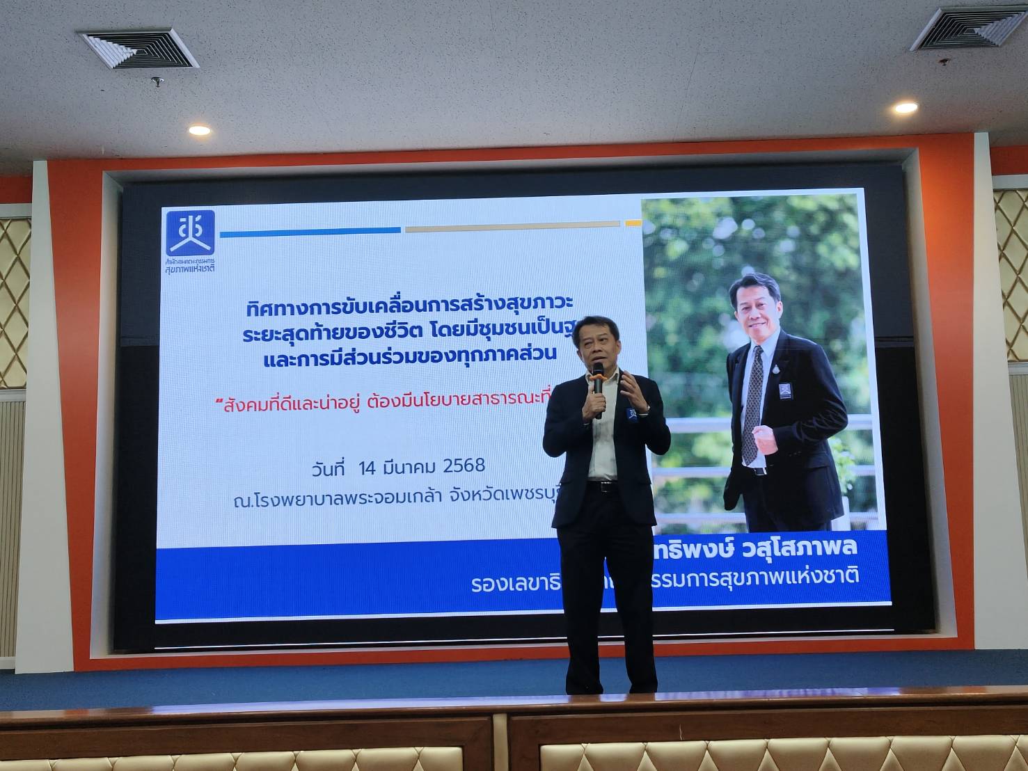 - นายสุทธิพงษ์ วสุโสภาพล รองเลขาธิการคณะกรรมการสุขภาพแห่งชาติ นำเสนอทิศทางและควาสำคัญของการการขับเคลื่อนการสร้างสุขภาวะระยะสุดท้ายมีชุมชนเป็นฐานโดยกระบวนการมีส่วนร่วมทุกภาคส่วนซึ่งบทบาทภารกิจที่สำคัญของ สช.