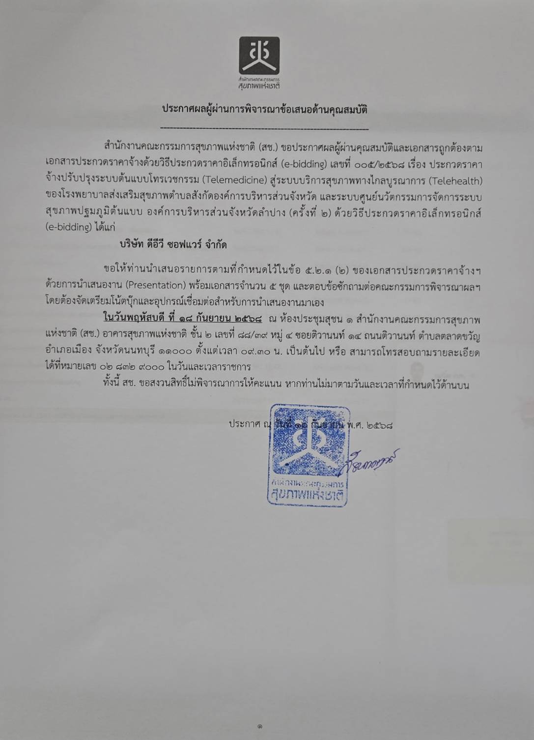 ประกาศผลผู้ผ่านการพิจารณาข้อเสนอด้านคุณสมบัติ สำหรับงานจ้างปรับปรุงระบบต้นแบบโทรเวชกรรม (Telemedicine) สู่ระบบบริการสุขภาพทางไกลบูรณาการ (Telehealth)
