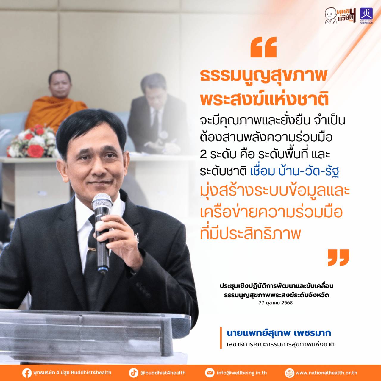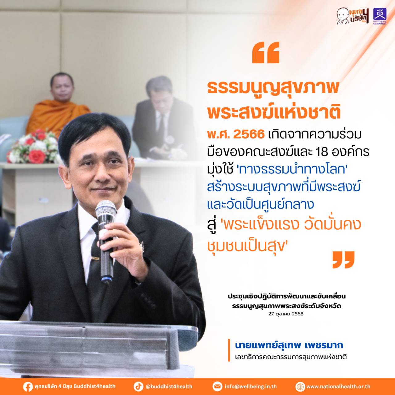 27 ตุลาคม 68 คณะสงฆ์ ผู้แทนหน่วยงานภาครัฐ ภาคีเครือข่ายสุขภาพ และผู้ที่เกี่ยวข้องทั่วประเทศ ร่วมสานพลังวางกลยุทธ์และแนวทางการขับเคลื่อนธรรมนูญสุขภาพพระสงฆ์แห่งชาติ พ.ศ. 2566 สู่การปฏิบัติในระดับพื้นที่อย่างเข้มแข็ง ในเวที “การประชุมเชิงปฏิบัติการพัฒนาและขับเคลื่อนธรรมนูญสุขภาพพระสงฆ์ระดับจังหวัด” โดยมีผู้เข้าร่วมทั้ง Online และ Onsite กว่า 100 คน