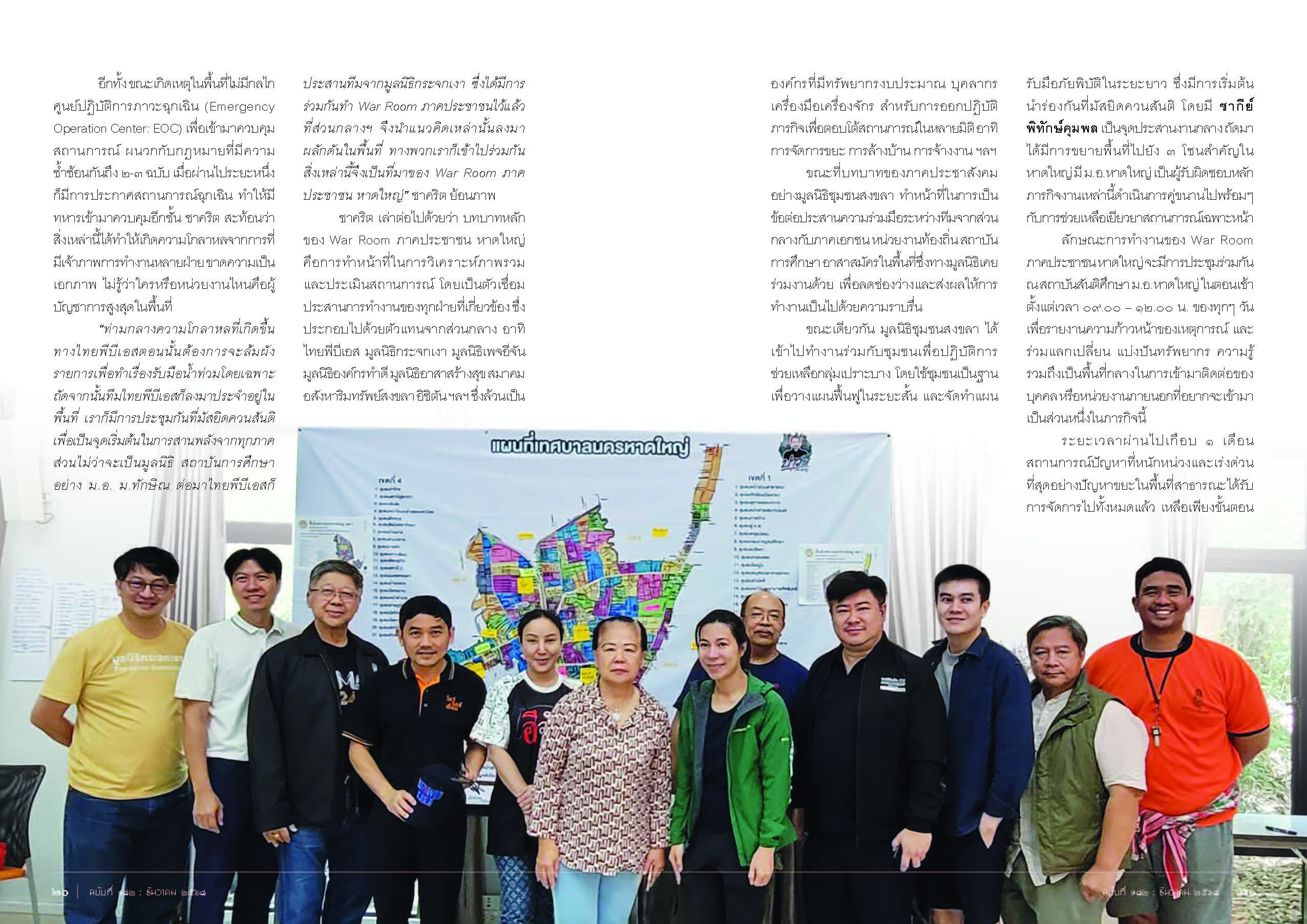 ชาคริต เล่าต่อไปด้วยว่า บทบาทหลักของ War Room ภาคประชาชน หาดใหญ่ คือการทำหน้าที่ในการวิเคราะห์ภาพรวมและประเมินสถานการณ์ โดยเป็นตัวเชื่อมประสานการทำงานของทุกฝ่ายที่เกี่ยวข้อง ซึ่งประกอบไปด้วยตัวแทนจากส่วนกลาง อาทิ ไทยพีบีเอส มูลนิธิกระจกเงา มูลนิธิเพจอีจัน มูลนิธิองค์กรทำดี มูลนิธิอาสาสร้างสุข สมาคมอสังหาริมทรัพย์สงขลา อิชิตัน ฯลฯ ซึ่งล้วนเป็นองค์กรที่มีทรัพยากรงบประมาณ บุคลากร เครื่องมือเครื่องจักร สำหรับการออกปฏิบัติภารกิจเพื่อตอบโต้สถานการณ์ในหลายมิติ อาทิ การจัดการขยะ การล้างบ้าน การจ้างงาน ฯลฯ