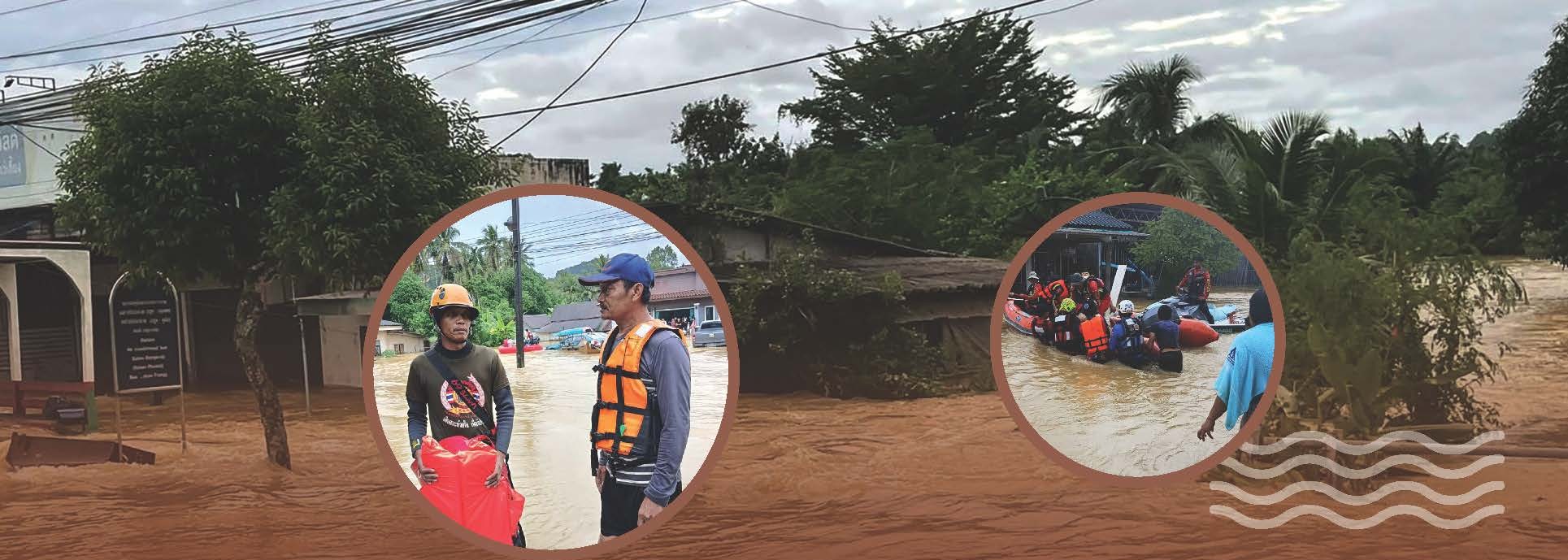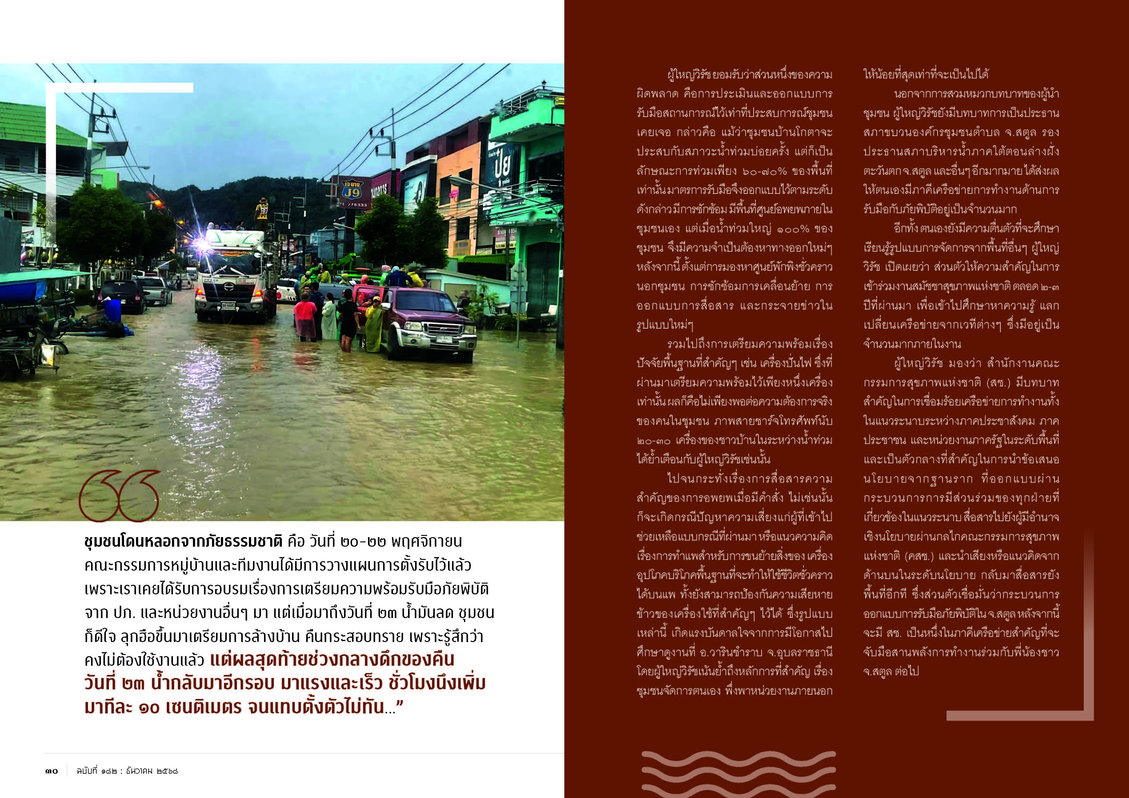 “ชุมชนโดนหลอกจากภัยธรรมชาติ คือ วันที่ ๒๐-๒๒ พฤศจิกายน คณะกรรมการหมู่บ้านและทีมงานได้มีการวางแผนการตั้งรับไว้แล้ว เพราะเราเคยได้รับการอบรมเรื่องการเตรียมความพร้อมรับมือภัยพิบัติจาก ปภ. และหน่วยงานอื่นๆ มา แต่เมื่อมาถึงวันที่ ๒๓ น้ำมันลด ชุมชนก็ดีใจ ลุกฮือขึ้นมาเตรียมการล้างบ้าน คืนกระสอบทราย เพราะรู้สึกว่าคงไม่ต้องใช้งานแล้ว แต่ผลสุดท้ายช่วงกลางดึกของคืนวันที่ ๒๓ น้ำกลับมาอีกรอบ มาแรงและเร็ว ชั่วโมงนึงเพิ่มมาทีละ ๑๐ เซนติเมตร จนแทบตั้งตัวไม่ทัน ผมนอนไม่หลับ โทรหาพรรคพวกที่ดูต้นน้ำ เขาบอกว่ามวลน้ำยังมีอีกเยอะ จึงแจ้งข่าวไปยังชาวบ้านทางไลน์กลุ่มชุมชนให้ไปรวมตัวกันเป็นกลุ่มอยู่ในบ้านญาติพี่น้องที่มีความสูง รอฟ้าสางแล้วค่อยดำเนินการเรื่องอพยพออกจากพื้นที่ เพราะคำนวณไว้แล้วว่าหากน้ำเพิ่มมาชั่วโมงละ ๑๐ เซนติเมตรแบบนี้ พวกเราอยู่กันไม่ได้แน่” ผู้ใหญ่วิรัช กล่าว