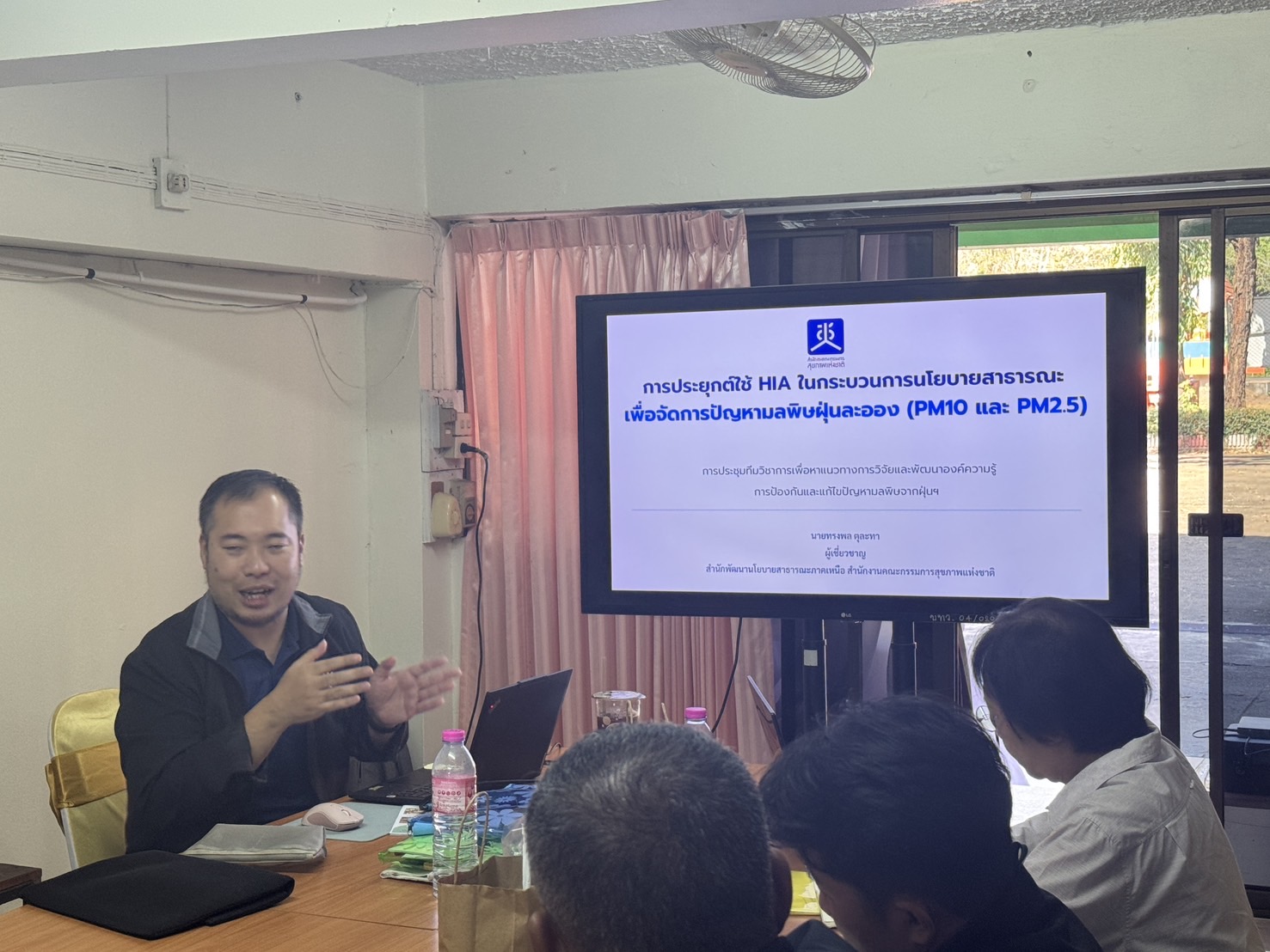 ในช่วงบ่าย มีการประชุมทีมวิชาการเพื่อหาแนวทางการศึกษาวิจัยและพัฒนาองค์ความรู้ในการป้องกันและแก้ไขปัญหามลพิษจากฝุ่นละอองขนาดเล็ก (PM 2.5) โดย นายทรงพล ตุละทา ผู้เชี่ยวชาญ สำนักงานคณะกรรมการสุขภาพแห่งชาติ ได้นำเสนอแนวทางการใช้ เครื่องมือการประเมินผลกระทบต่อสุขภาพ (Health Impact Assessment: HIA) เพื่อสนับสนุนการกำหนดนโยบายและมาตรการเชิงพื้นที่