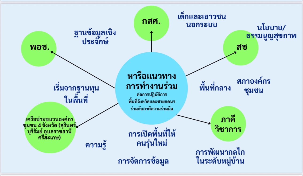 พร้อมกันนี้ ยังเน้นการทำงานแบบบูรณาการกับภาคีสำคัญ เช่น พอช. และ กสศ. เพื่อร่วมกันสร้าง “นิเวศการเรียนรู้” ที่ครอบคลุมทั้งมิติที่อยู่อาศัย การศึกษา และสุขภาพ โดยเฉพาะในพื้นที่ชายแดนที่เผชิญวิกฤติซ้อนวิกฤติ ซึ่งจำเป็นต้องมีระบบดูแลสุขภาวะที่ยืดหยุ่นและเข้มแข็งจากฐานชุมชน