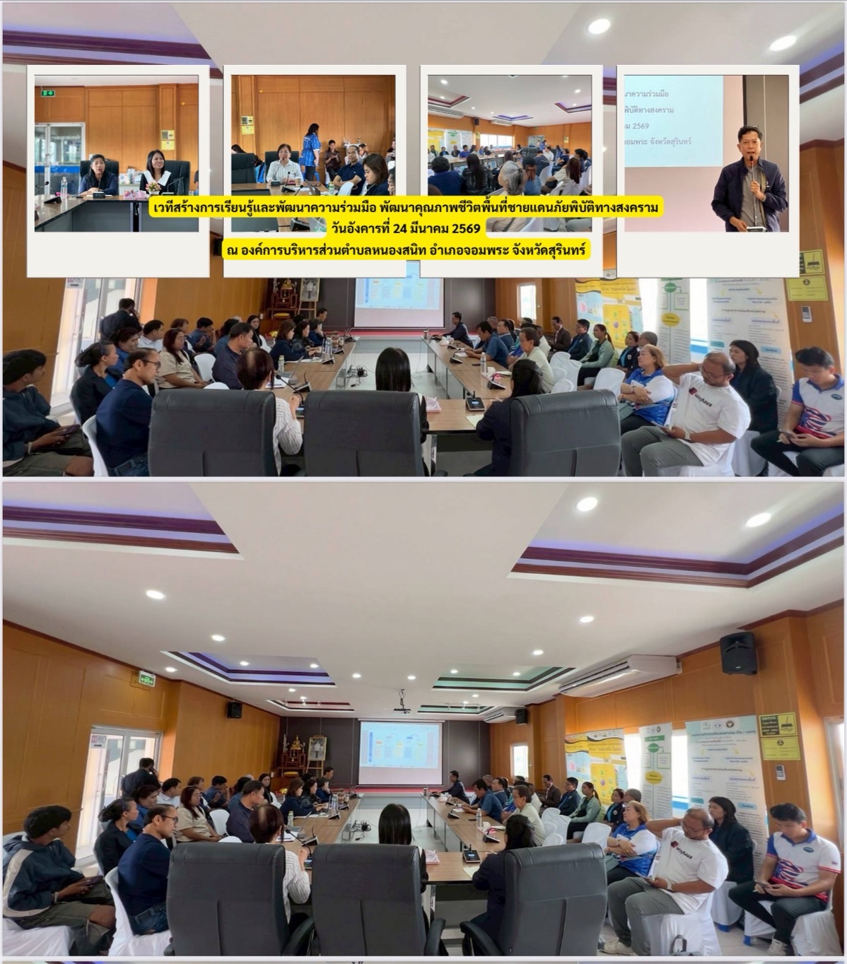 ท่ามกลางสถานการณ์เปราะบางของพื้นที่ชายแดนภาคตะวันออกเฉียงเหนือที่ยังคงเผชิญความท้าทายจากวิกฤติความมั่นคง สงครามชายแดน และผลกระทบด้านพลังงาน ได้เกิดความพยายามในการสร้าง “พื้นที่เรียนรู้ร่วม” เพื่อยกระดับคุณภาพชีวิตของชุมชนอย่างเป็นระบบ โดยเมื่อวันที่ 24 มีนาคม 2569 ณ องค์การบริหารส่วนตำบลหนองสนิท อำเภอจอมพระ จังหวัดสุรินทร์ ได้มีการจัดเวที “การสร้างการเรียนรู้และพัฒนาความร่วมมือคุณภาพชีวิตพื้นที่ชายแดนภัยพิบัติทางสงคราม” ซึ่งเป็นการรวมพลังของภาคีเครือข่ายจากหลายภาคส่วน เพื่อร่วมแลกเปลี่ยนบทเรียน เชื่อมโยงองค์ความรู้ และออกแบบแนวทางการทำงานร่วมกันในการรับมือวิกฤติซ้อนวิกฤติ โดยใช้พื้นที่ “หนองสนิท” เป็นฐานการเรียนรู้เชิงปฏิบัติการที่สะท้อนศักยภาพของชุมชนในการลุกขึ้นมาจัดการตนเองอย่างเข้มแข็ง