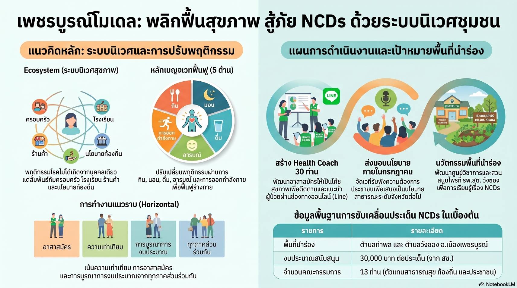 🟤 ดังนี้ สมัชชาสุขภาพจังหวัดเพชรบูรณ์ได้กำหนดยุทธศาสตร์การขับเคลื่อนผ่านแนวคิดนโยบายสาธารณะแบบมีส่วนร่วมบนฐานปัญญา (4P-W) โดยมุ่งเน้น 3 แนวทางหลัก ได้แก่ 🔹การพัฒนาพื้นที่ต้นแบบในตำบลท่าพลเพื่อสร้างระบบนิเวศสุขภาพ 🔹การเสริมพลังเครือข่ายทุกภาคส่วนในการร่วมออกแบบมาตรการป้องกันโรค และ🔹การสังเคราะห์บทเรียนจากพื้นที่จริงสู่ข้อเสนอเชิงนโยบายระดับจังหวัด