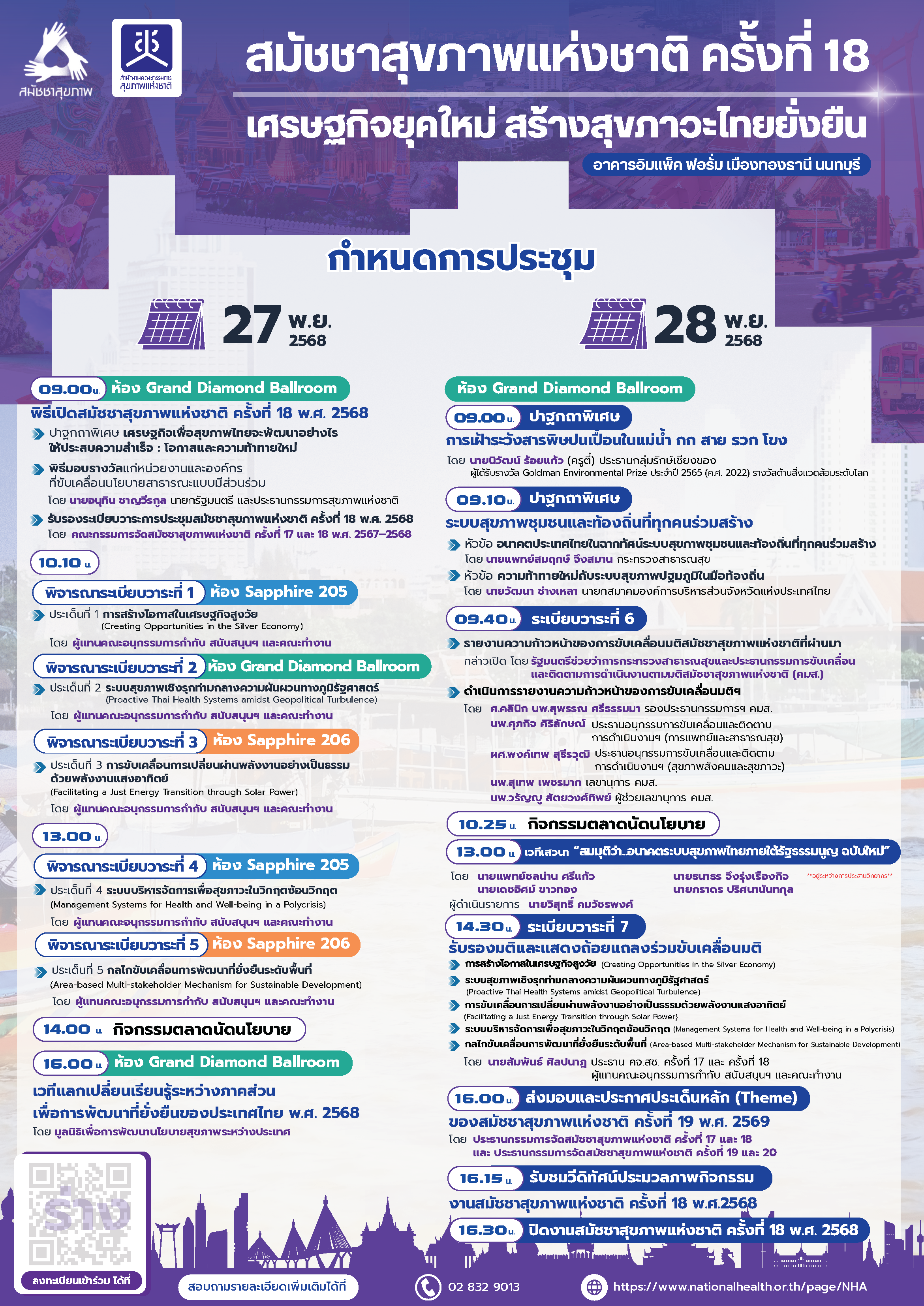 สมัชชาสุขภาพแห่งชาติ จัดอย่างเป็นทางการ ครั้งแรกใน ปี พ.ศ.2551 และจัดเป็นประจำทุกปี ต่อเนื่องเรื่อยมา จนถึง ครั้งที่ 17 ในปี พ.ศ.2567 ปัจจุบันได้ข้อเสนอเชิงนโยบายจากสมัชชาสุขภาพ แห่งชาติ รวม 98 มติ และมีการผลักดันไปสู่การปฏิบัติ ทั้งในระดับชาติ ระดับกระทรวง กรม ระดับจังหวัด และระดับชุมชนท้องถิ่น ขณะเดียวกันได้มีการ พัฒนากระบวนการให้มีความเป็นระบบและสร้างการมีส่วนร่วมมากขึ้นเป็นลำดับ